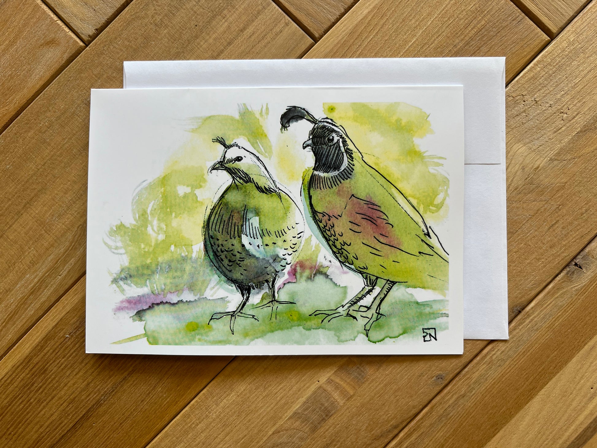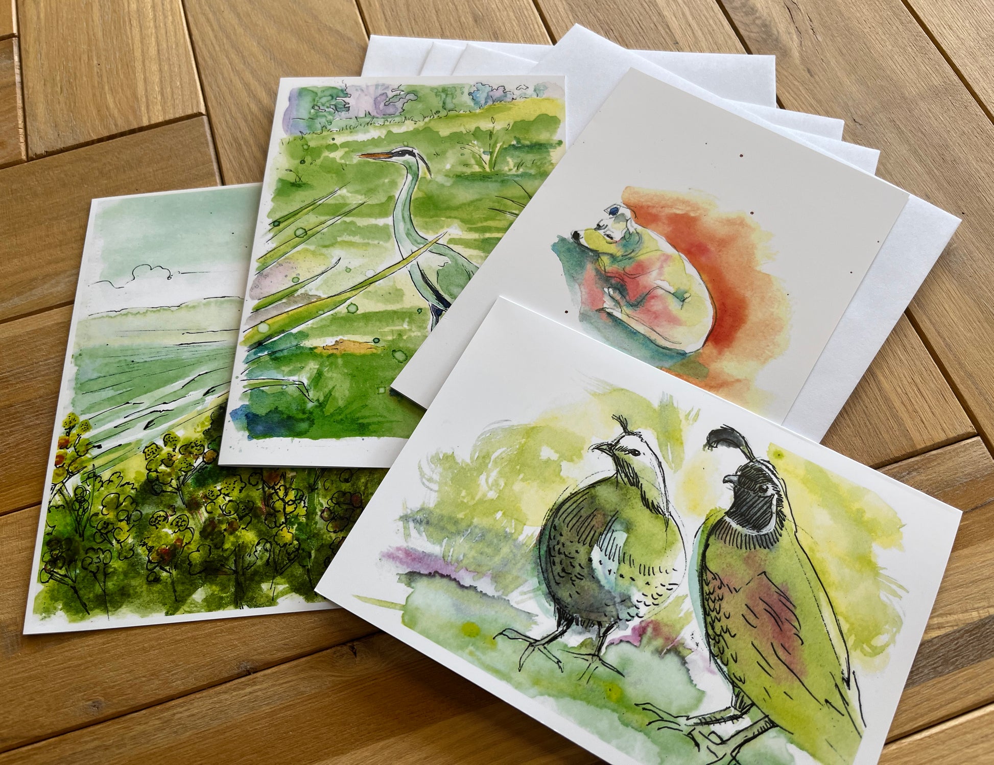 Watercolor + pen prints of things near and dear to my heart. A pack of 12 includes 3 of each design and envelopes.